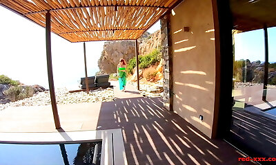 Busty redhead Milf Red XXX gets off poolside