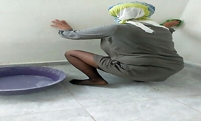 Hijab damsel cleaning kitchen