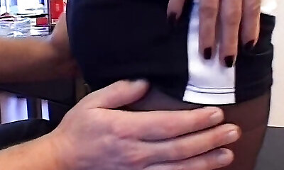 Chief secretly Jerks off to his Secretary and Cums on her Legs in Pantyhose